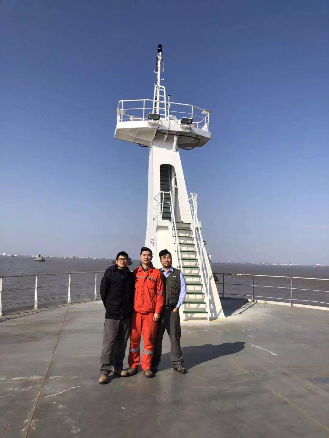 (从左至右)西门子(中国)有限公司过程工业解决方案船舶事业部“东方红3”船项目组高级工程师郭其钰、主任工程师及技术经理张武与高级工程师詹大鹏随“东方红3”船出海,完成针对西门子解决方案相关产品的试航。