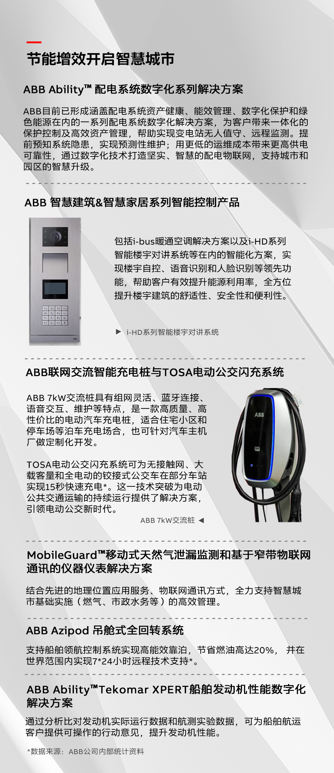 智慧城市建设是全球范围内城市发展的未来趋势,ABB一直关注智能交通、智能楼宇等核心技术在市政基础设施升级、节能减排等方面的应用,积极参与推动中国建设拥有清洁能源、绿色交通和指挥楼宇的世界级城市群。