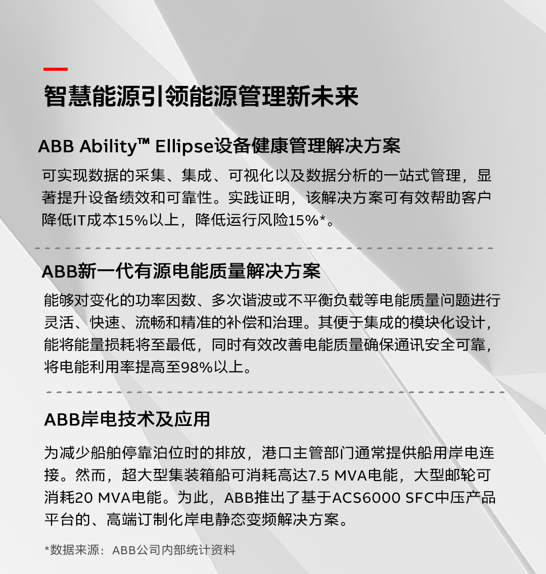 日益复杂的电网对于电力设备的数字化、可靠性和灵活性提出了前所未有的高要求。基于ABB Ability™的数字化技术解决方案将先进的电力产品与数字化传感器、云计算和软件相结合,实现运营技术和信息技术的融合,进一步帮助客户提升生产效率,改善能源效率并持续降低对环境的影响。