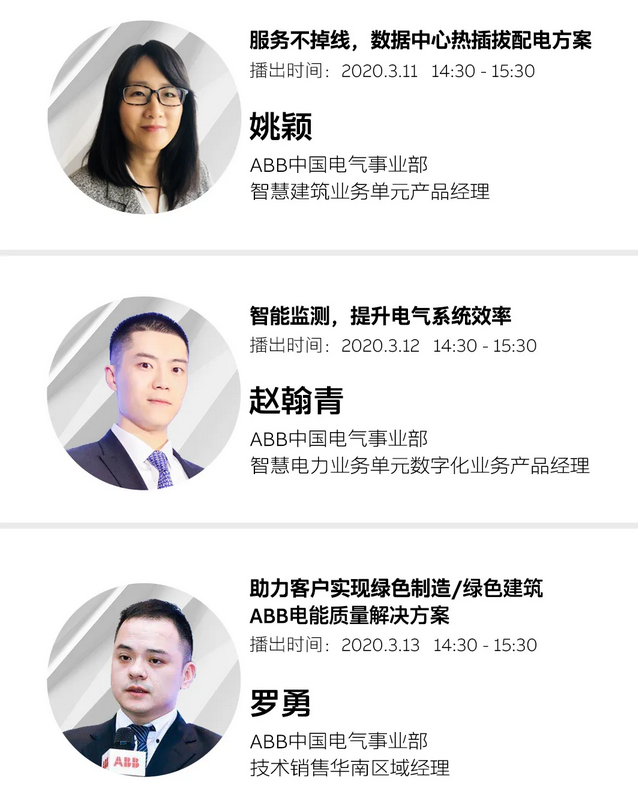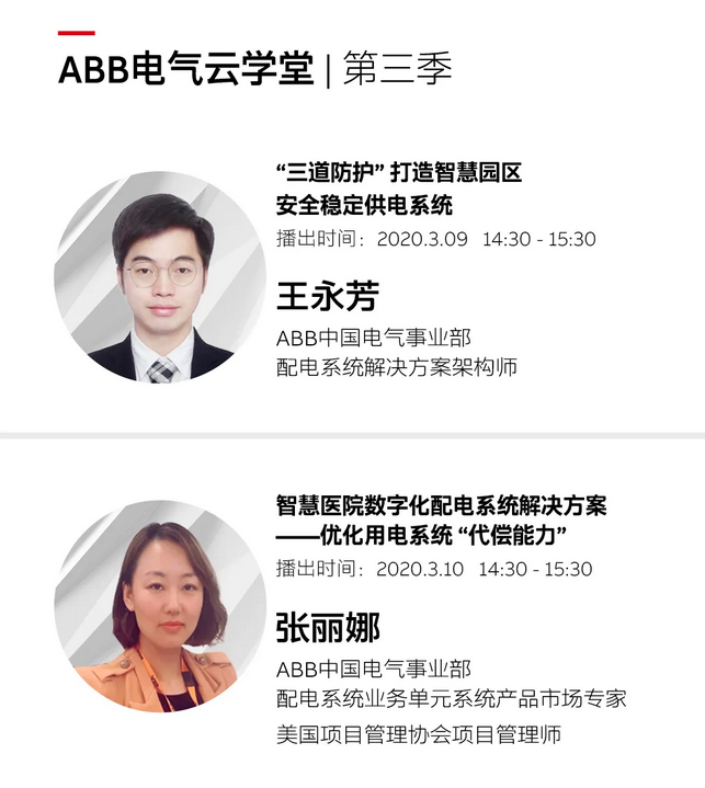 5位大咖坐镇 ABB电气云学堂第三季重磅来袭 3月9日-13日,ABB中国电气事业部再次推出ABB电气云学堂第三季,并派出5位智能配电领域的大咖坐镇,以详实的案例,从多个角度带你探索智能配电的奥秘。 开关设备为何频频告警? 电费账单为何无序波动? 线路与负载事故频发究竟为哪般? 本周便让我们跟随本季云学堂,走入智能监测的世界,一起发现电气系统的真相。 听课有奖 惊喜好礼等你拿 除了五位电气行业资深讲师的精彩分享,本季云学堂还设置了有奖问答和有奖问卷调查环节,我们会从参与课间答题以及课后填写调查问卷的小伙伴中分别选取三位(共六位)幸运小伙伴,奉上精心准备的神秘好礼。 Q: 如何参加有奖问答? A: 3月9日-13日,每天在线课堂期间,讲师将适时围绕课堂内容进行提问,同学可将答案发送至平台留言区参与问答活动。 Q: 评奖标准是什么: A: 答题正确率+发送时间。我们会将所有同学的答题留言,按正确率和发送时间先后顺序进行排名,并评选出排名前三的“学神”送出神秘好礼。每堂课的获奖名单,将于相关课程直播当日的18:00之前,在本篇推文下方的留言区公布。 Q: 如何参加有奖问卷调查? A: 每堂课后,我们将从参与问卷调查的同学当中,随机抽取3名幸运观众,于当日18:00之前在本篇推文的留言区公布获奖名单,并根据幸运名单尽快寄出神秘好礼。 报名方式 扫描或长按识别下方二维码,即可报名参加ABB电气云学堂。 您还可以通过下述网址在PC端登录:http://www.2025china.cn/customer/abb/live/ 以上资讯转自ABB电气产品,如有侵权请联系删除